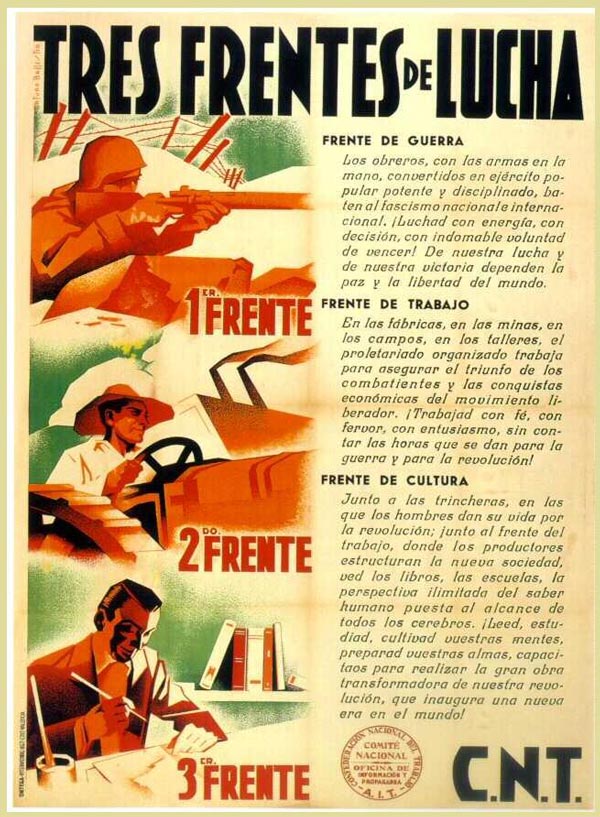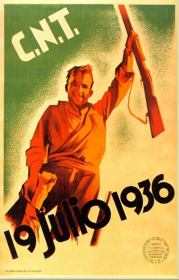 «Προσοχή, σύντροφοι! Αξίζει περισσότερο να προετοιμάζεσαι με θάρρος –κι ας κάνεις λάθος-, παρά να θρηνείς λόγω ολιγωρίας» (Εθνική Επιτροπή της CNT, Σαραγόσα, 14 Φλεβάρη 1936). – Συμπληρώνονται 80 χρόνια από την έναρξη της Ισπανικής Επανάστασης. Εργάτες και αγρότες μετά από μια μεγαλειώδη γενική απεργία που κηρύχθηκε για να ενισχύσει το Λαϊκό Μέτωπο, συνασπισμό αριστερών κομμάτων που κυβερνούσε στην Ισπανία και αδυνατούσε να αντιμετωπίσει τη φασιστική απειλή του Φράνκο, το μεγαλύτερο συνδικάτο της χώρας η CNT με 2.000.000 ενεργά μέλη παίρνει την κατάσταση στα χέρια του. Οργανώνει ένοπλες δυνάμεις λαϊκής πολιτοφυλακής και καταλαμβάνει τα μέσα παραγωγής.